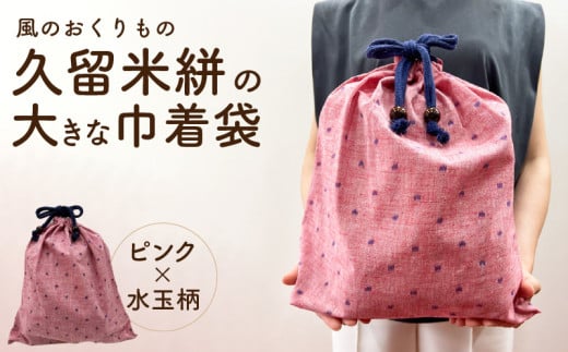久留米絣の大きな巾着袋(ピンク水玉柄)_久留米絣 大きい 巾着袋 縦 40cm × 横 35cm カラー ピンク 水玉柄 綿100% 大きめサイズ 旅行 スポーツ バックインバッグ ギフトバッグ 着替え入れ おもちゃ入れ 福岡県 久留米市 送料無料_Jk071