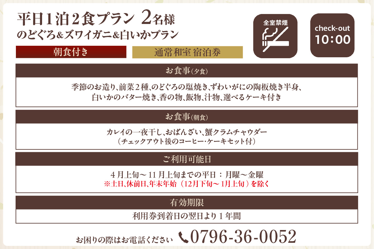 - 【平日 1泊2プラン のどぐろ&ズワイガニ&白いかコース 通常和室 2名様 宿泊券】事前予約制 ご利用可能日要確認 ご入金確認後、順次発送 ふるさと納税 兵庫県 香美町 夕香楼しょう和 35-10