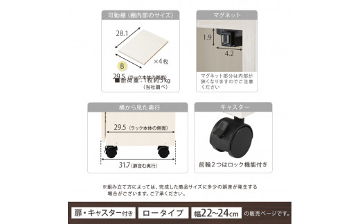 - 【国産家具】オーダーすき間ラック〔幅23cm・キャスター・扉付き・ロータイプ〕(ホワイト)すき間ラック 収納棚 約 奥行32 高さ96 扉付き キャスター付き スリム ロータイプ 本棚 縦長 棚 オーダーラック 隙間収納 キッチン ラック 扉付き本棚 薄型 木製 扉付 5段 ABE400107-23-WH