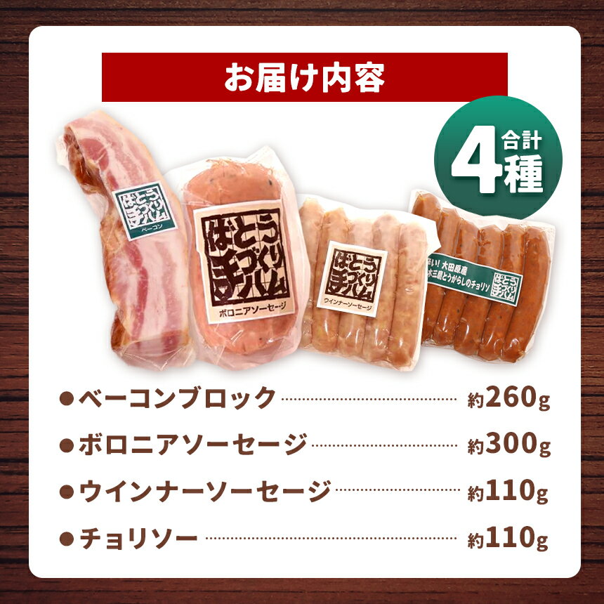 - 【ふるさと納税】 ばとう 手づくり ハム 茶色豚のベーコンセット |ベーコンブロック ウインナー ソーセージ チョリソー ボロニアソーセージ 手作り 贈り物 贈答品 肉 豚肉 馬頭 栃木県 那珂川町 送料無料 ハム セット ふるさと 納税 美味しい ブロック