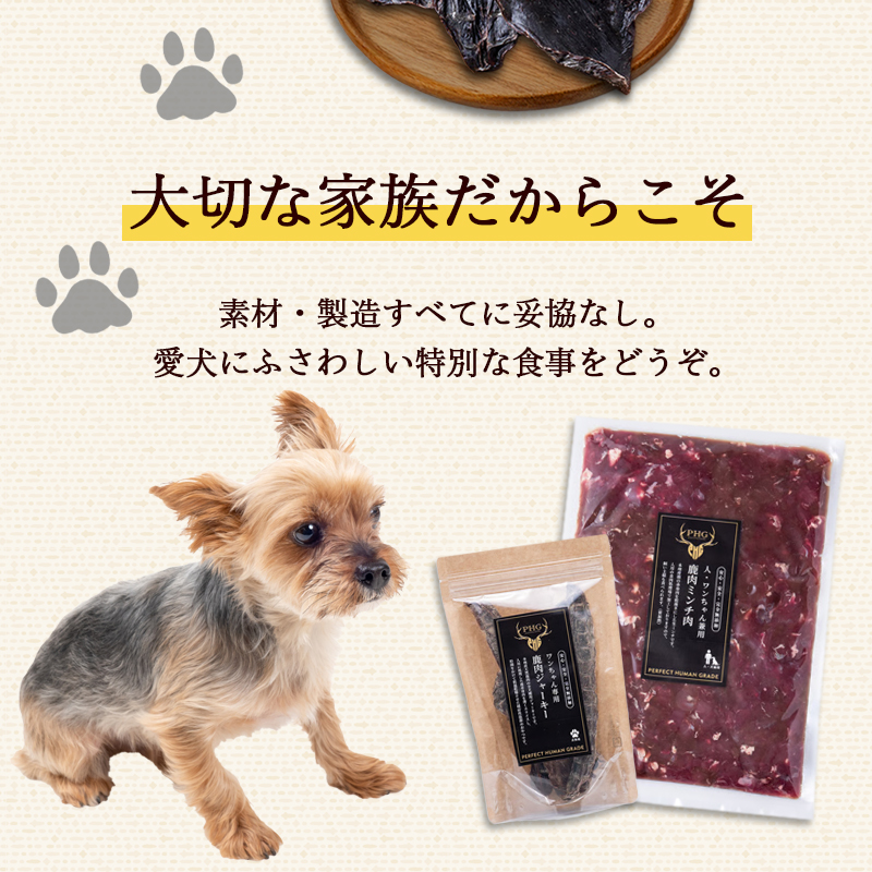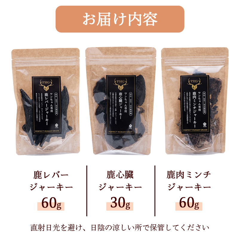 - PHG 鹿肉ジャーキー 希少部位 3種セット 【 ジビエ 鹿レバー 鹿心臓 ミンチ ジャーキー ペットフード おやつ ご褒美 ヒューマングレード ペット用品 安心 安全 国産 】