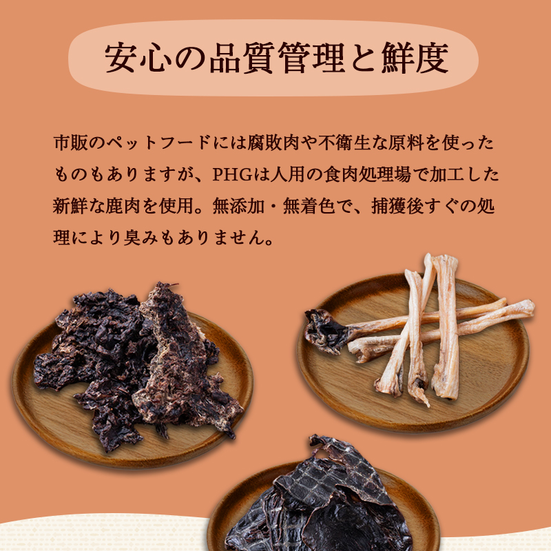 PHG 鹿肉ジャーキー 希少部位 3種セット 【 ジビエ 鹿レバー 鹿心臓 ミンチ ジャーキー ペットフード おやつ ご褒美 ヒューマングレード ペット用品 安心 安全 国産 】