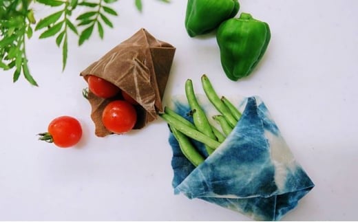 - 藍染草木染エコラップ2枚セット(S,M) 茶色、緑セット(たんがら染、藍×かりやす染)