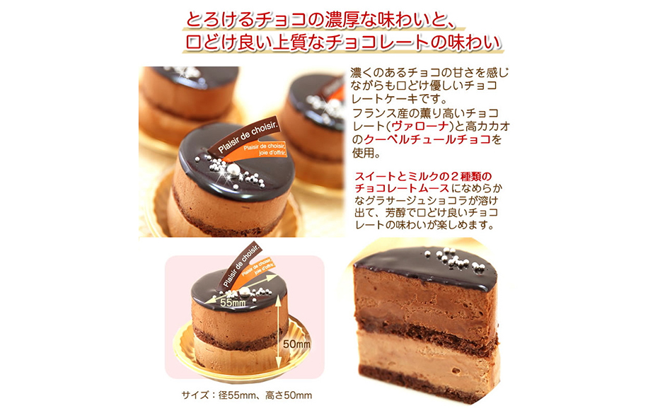 コクのあるチョコの甘さと、優しい口どけが特徴のチョコレートケーキです。 世界のトップ・パティシエたち御用達のフランス産チョコレート「ヴァローナ」と、高カカオのクーベルチュールチョコレートを使用。 「スイート」と「ミルク」の2層のチョコレートムースになめらかなグラサージュ(ショコラ)が調和。一つのケーキで、さまざまな味わいのチョコレートが楽しめます。