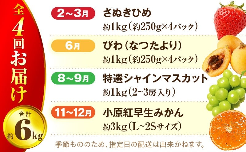 さぬき旬のフルーツお楽しみ 4回定期便 | 果物 フルーツ 青果 青果物 いちご びわ みかん シャインマスカット さぬきひめ 小原紅早生みかん マスカット なつたより 旬の果物 季節の果物 贈答 贈り物 ギフト 化粧箱 取り寄せ 香川県 三木町 送料無料 |_mk006-t015