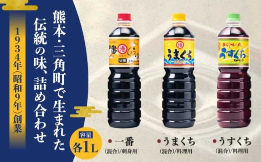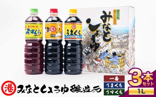 - 【ふるさと納税】しょうゆ みなとしょうゆ詰合せ 1L×3本セット(一番、うまくち、うすくち) 醤油 セット 一番しょうゆ 甘露 うまくちしょうゆ うすくちしょうゆ 薄口 濃口 九州 詰め合わせ 送料無料