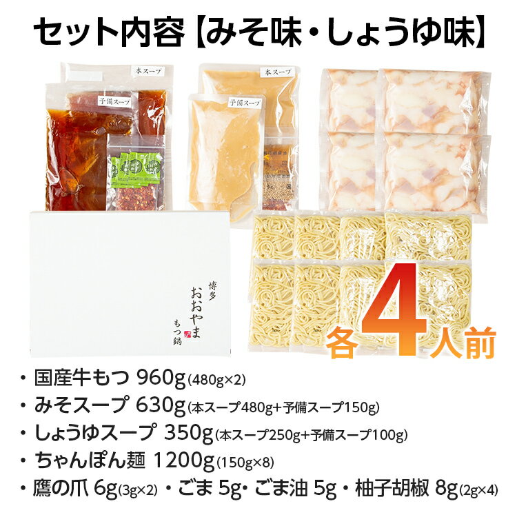 - 【ふるさと納税】「おおやま」博多もつ鍋(みそ味・しょうゆ味/各4人前) お取り寄せグルメ お取り寄せ 福岡 お土産 九州 ご当地グルメ 福岡土産 取り寄せ グルメ 福岡県 食品