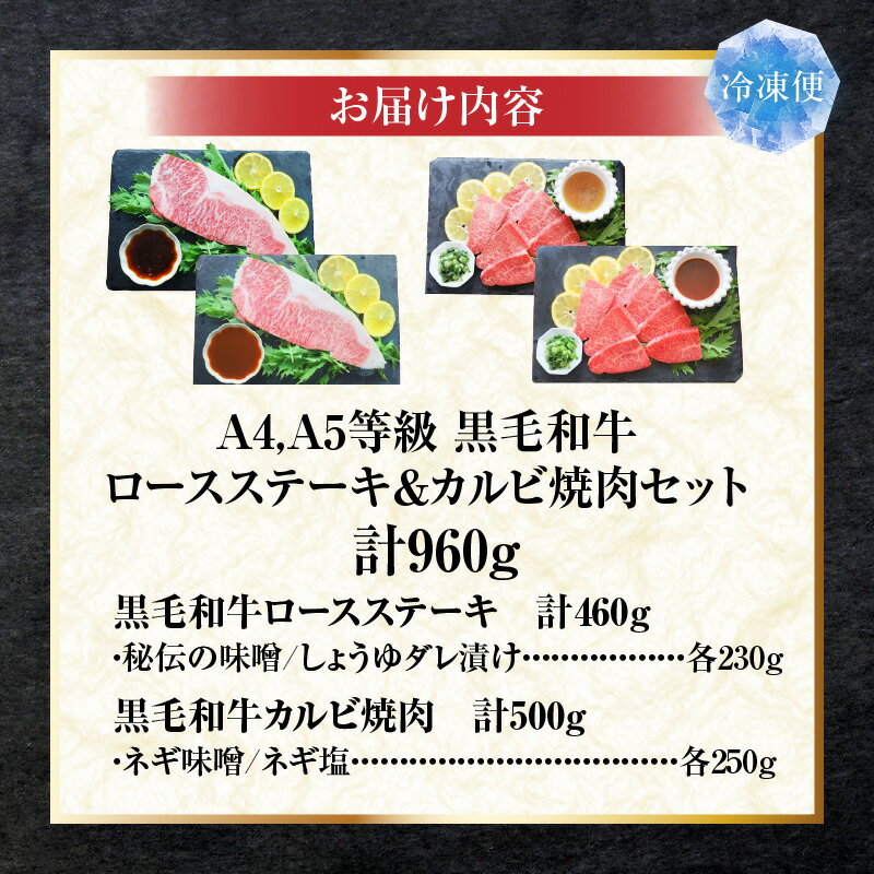 - 【ふるさと納税】《ステーキ&焼肉4種食べ比べ》A4・A5等級 黒毛和牛ロースステーキ&カルビ焼肉セット 計960g 肉 黒毛和牛 焼肉 柔らかい 牛ロース やきにく ロース ステーキ カルビ セット 冷凍 BBQ バーベキュー 香川県 三木町 おすすめ
