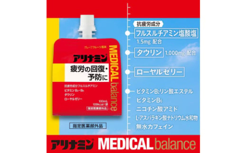 アリナミンメディカルバランス グレープ味 100ml×36個 / ゼリー フルスルチアミン ビタミンB2 B6 タウリン ローヤルゼリー 防災 備蓄 トレーニング 登山 ロードレース 行動食 カロリー補給 エネルギー 集中力 維持 改善 疲労回復 予防 集中 キャンプ ドライブ 空腹 仕事 勉強 サウナ 風呂 奈良県 葛城市【tept017】