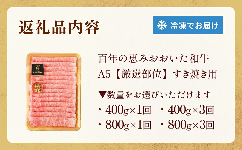 - 【ふるさと納税】「百年の恵み おおいた和牛」A5すき焼き 400g - 800g 配送回数が選べる 1回 / 3回 定期便 おおいた和牛 黒毛和牛 牛肉 すき焼き用 A5等級 大分県 霜降り ロース 肩ロース もも 肩部位 スライス 風味 豊か 脂肪質 種雄牛 血統 厳選部位