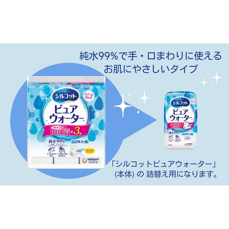 シルコット ピュアウォーター ウェットティッシュ 詰替(58枚×3P)×8袋 日用品 純水99% 手口拭き 口周り 肌にやさしい 厚手 やわらかシート 拭き取り 食べこぼし 手拭き