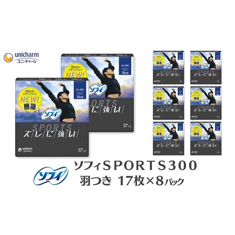 - ソフィ SPORTS300羽つき 17枚 ×8 日用品 生理用品 ナプキン ずれに強い スポーツ用 ユニチャーム