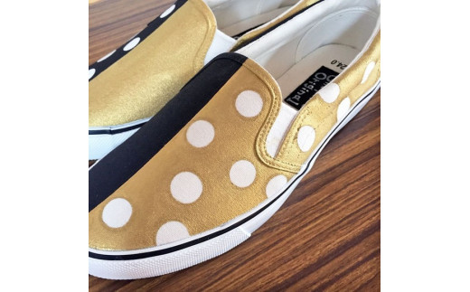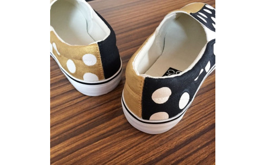- 手描きスニーカー「bell」23.0cm ゴールド×ブラック 水玉柄【受注制作】
