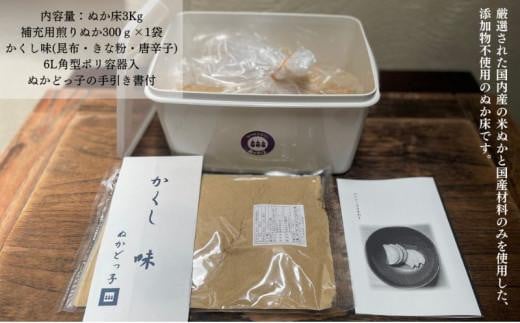 <ぬかどっ子> 熟成ぬか床 キット【ぬか床3Kg, 補充用煎りぬか300g×1袋, かくし味(昆布・きな粉・唐辛子)×1袋 ,ポリ容器入】無添加 国産原料 漬物 糠 乳酸菌 発酵■