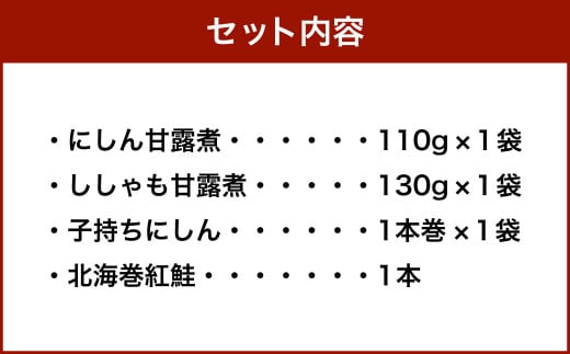 甘露煮 詰合せ ( にしん甘露煮 110g×1袋 ・ ししゃも甘露煮 130g×1袋 ・ 子持ちにしん 1本巻×1袋 ・ 北海巻紅鮭 1本 ) 鰊 ニシン シシャモ カラフトししゃも 数の子 紅鮭 鮭 甘露煮 甘タレ 昆布巻 昆布 常温