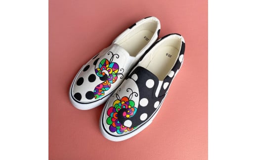 - 手描きスニーカー「ジャズ」22.5cm 水玉模様 アシンメトリー【受注制作】