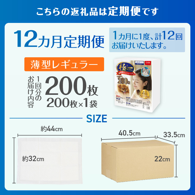 - 定期便 全12回 ペットシーツ 【極】シリーズ 薄型レギュラー 200枚 ペット用 犬用 猫用 トイレシーツ 日用品 ペット用品 防災 備蓄 消耗品 ドッグ キャット わんちゃん ねこちゃん 静岡県 富士市 [sf077-137]