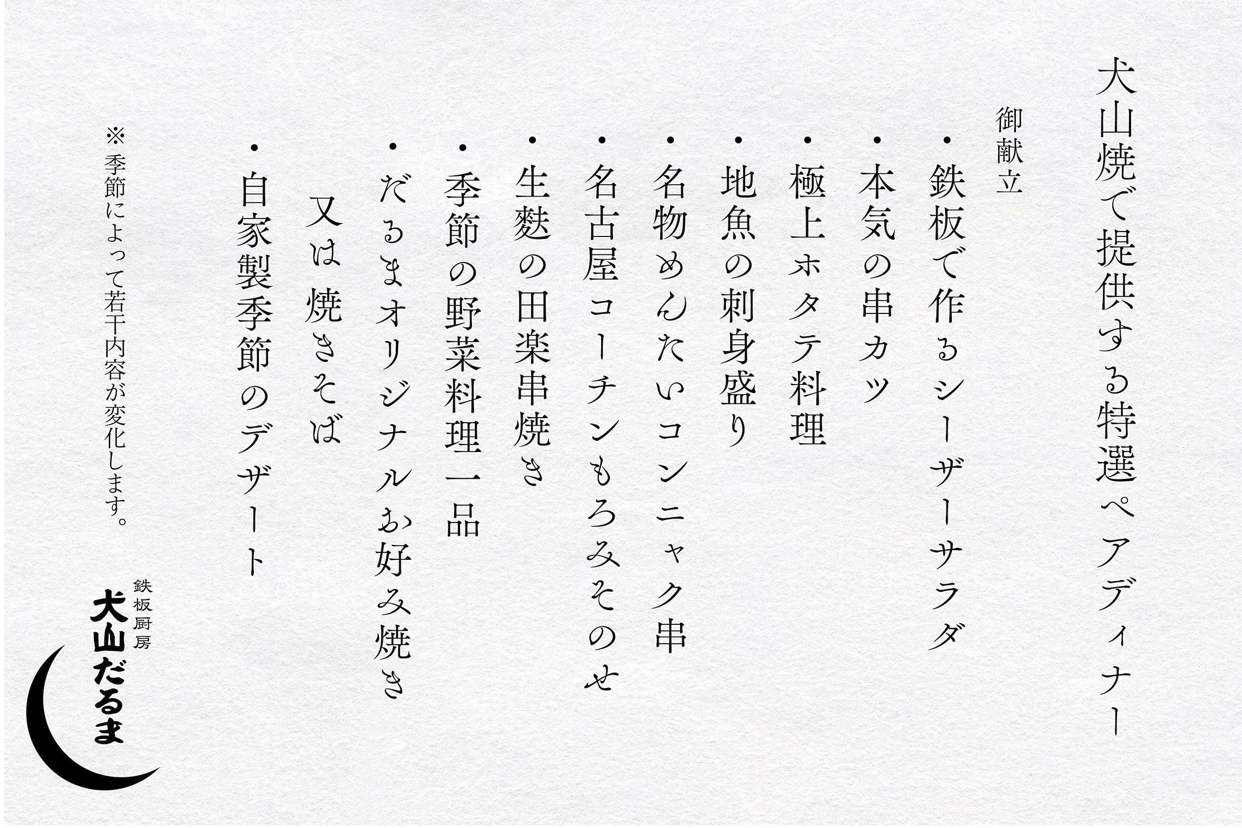 - 35-8_犬山だるま 犬山焼で提供する特選ペアディナー食事券(1組2名分)| 鉄板焼 レストラン 居酒屋 チケット ペアチケット スペシャル ディナー お食事券 お食事会 鉄板厨房 犬山 だるま デート ごほうび 名古屋 近郊 食事 東海 愛知 岐阜 尾張