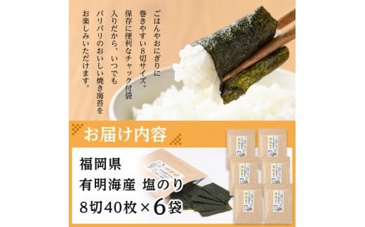 有明海産 塩のり 有明のり(計240枚:8切40枚×6袋) のり 味海苔 味のり 味付き しお おにぎり 常温 常温保存【ksg0369】【朝ごはん本舗】