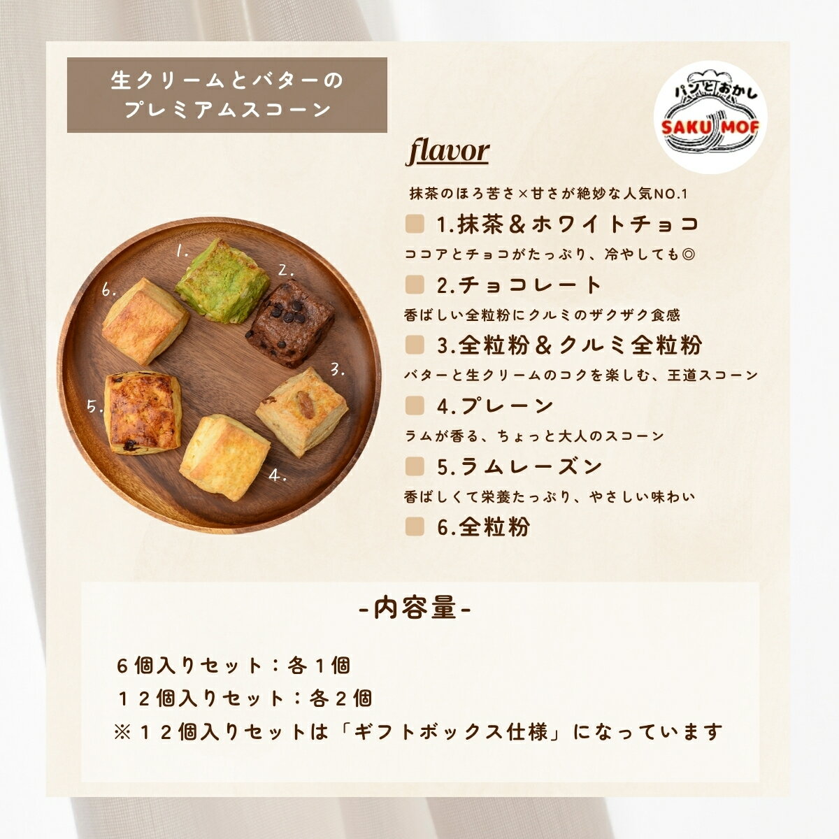 - 【ふるさと納税】<選べるセット数>生クリームとバターのプレミアムスコーン 6個または12個セット | スコーン 焼き菓子 国産バター ギフト お取り寄せ プレーン 抹茶 ホワイトチョコ 全粒粉 ラムレーズン クルミ チョコレート SAKUMOF パンとお菓子SAKUMOF 草加市 埼玉県