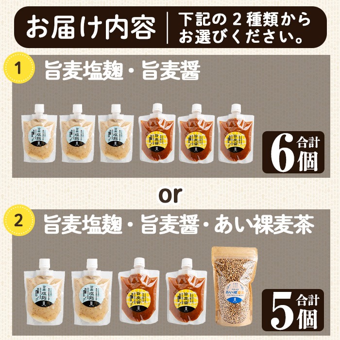 - a954 <種類が選べる>あい裸麦セット!【あいらぼ】姶良市 麦塩麹 塩麹 こうじ タレ たれ 万能調味料 料理 和食 発酵食品 調味料 麦茶 お茶 セット 詰め合わせ 小分け