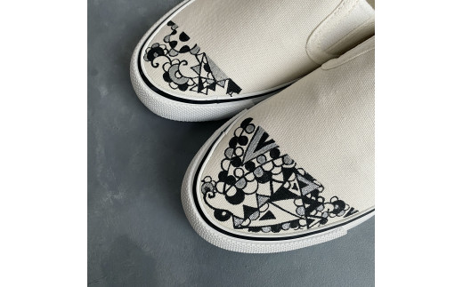 - 手描きスニーカー「ミュルクWA」24.0cm 白地 幾何学模様【受注制作】