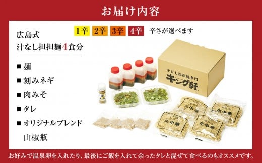 - キング軒の広島式汁なし担担麺4食セット<1辛~4辛>