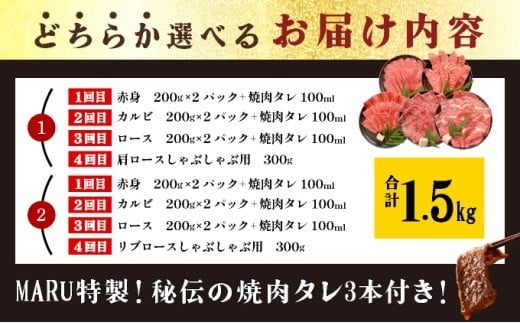 【2025年11月以降順次発送】【定期便】希少な特選石垣牛をご家庭で!!全4回合計1.5kgの焼肉セット 特選石垣牛焼肉&しゃぶしゃぶセット&石垣牛 MARU秘伝の焼肉タレ100ml×3本 | 沖縄 石垣 特選 牛 赤身 モモ ランプ カルビ ロース 肉 焼肉 食べ比べ 真空 冷凍 タレ 定期便 | IM-46t/IM-47t