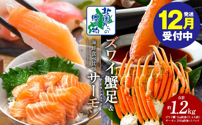020C398y 【年内発送】ズワイガニ足 1kg 3-4Lサイズ 蟹酢付 昆布塩加工 & アトランティックサーモン 200g 海鮮食べ比べセット【北国からの贈り物】