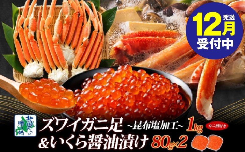 - 099H3450y 【年内発送】昆布塩風味 ズワイガニ足 1kg前後 カニ 蟹&いくら醤油漬け80g×2パック 海鮮食べ比べセット