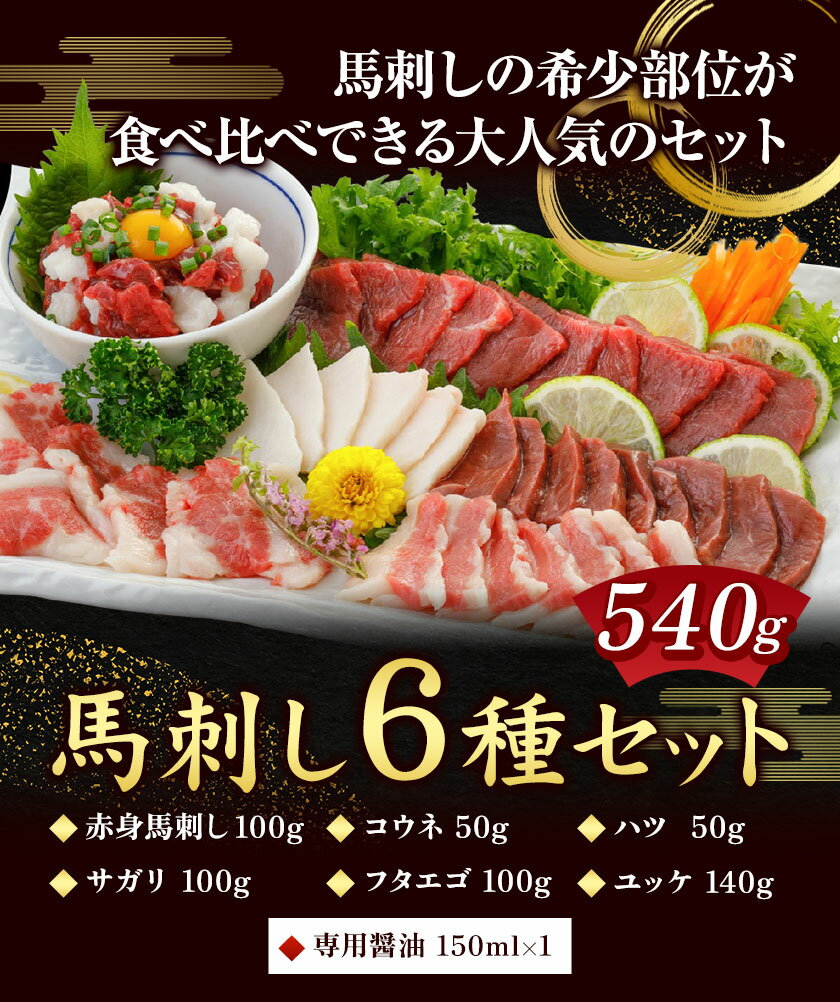 【ふるさと納税】馬刺し 6種 セット 540g 醤油 タレ 付き 桜屋 《30日以内に出荷予定(土日祝除く)》熊本県 葦北郡 津奈木町 送料無料 肉 馬肉 馬さし 赤身 タテガミ ハツ サガリ フタエゴ ユッケ
