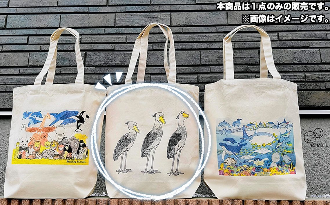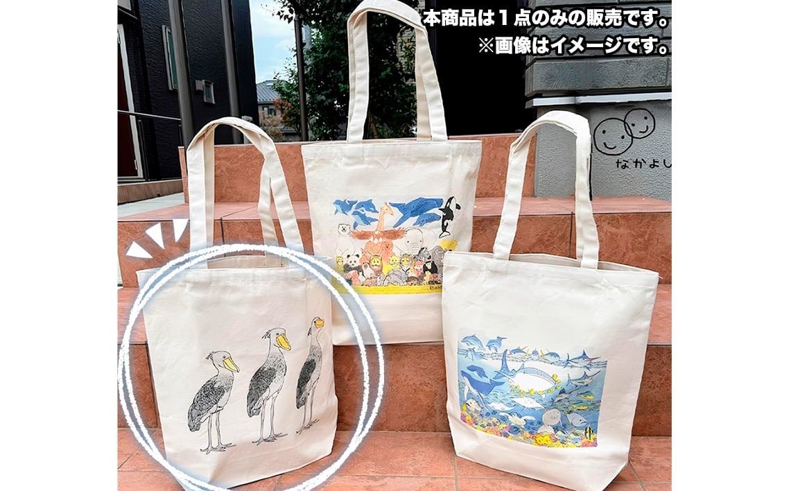 トートバッグ「ハシビロコウ」 / 鞄 かばん バッグ 手さげ プリント キャンバス 代表作 魅力的 動かない鳥 表情 羽根 東京都 [No.251]
