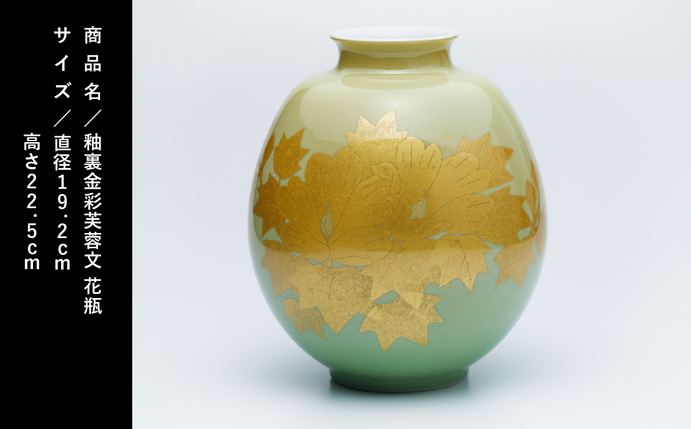 九谷焼「 釉裏金彩芙蓉文 花瓶(裏なし)」人間国宝 吉田美統 A00084