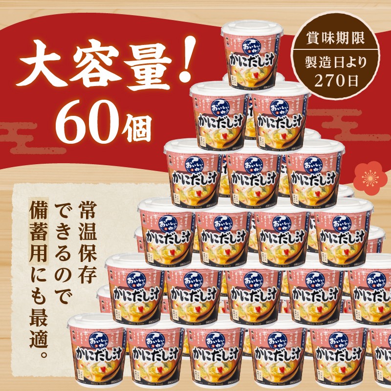 - (WR74)神州一味噌 おいしいね!! かにだし汁 60食(1食×6個×10箱) 味噌汁 カップ味噌汁 インスタント レトルト みそ汁 備蓄 非常食 保存食 簡単 便利 即席 発酵食品 朝食 ランチ 夜食 お弁当のお供に 防災 大容量 常温保存 ローリングストック 送料無料 山梨県 上野原市