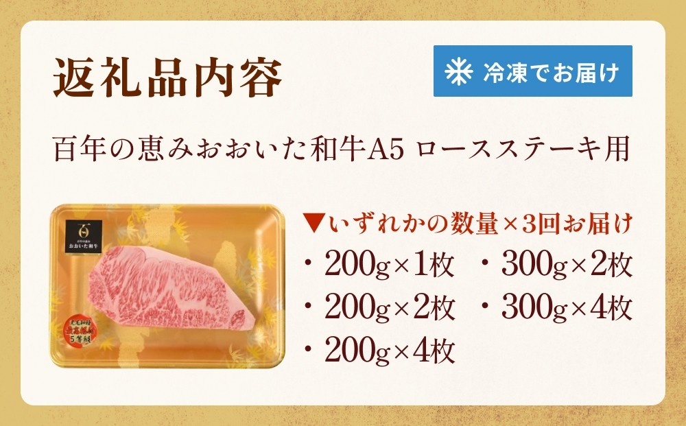 - 「百年の恵み おおいた和牛 」A5 ロースステーキ用 (200g×1枚- 4枚)or (300g×2枚- 4枚)×3ヶ月 定期便 おおいた和牛 ロースステーキ A5等級 黒毛和牛 大分県産 牛肉 高級肉 霜降り 和牛ステーキ 風味豊か 脂質 種雄牛 血統 高評価 冷凍