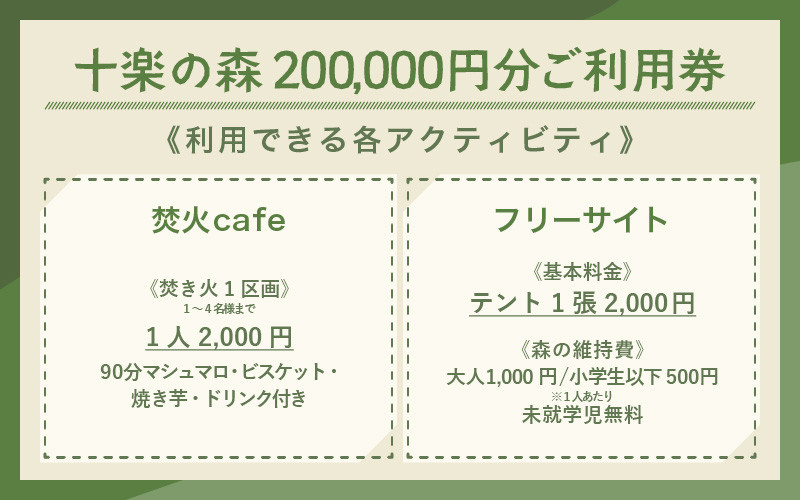 - 「十楽の森」 200,000円分 利用券 <キャンプ・BBQ・ドッグラン・飲食楽しめる施設> / あわら 体験 チケット 施設 アウトドア グランピング バーベキュー 道具 レンタル テント ノルディスク