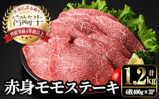 - 宮崎牛 モモ ステーキ(計1.2kg・4枚400g×3P) お肉 牛肉 黒毛和牛 宮崎牛 ブランド和牛 冷凍 国産 モモ 赤身 ステーキ 宮崎県産 【YM-04】【YAMATO株式会社】