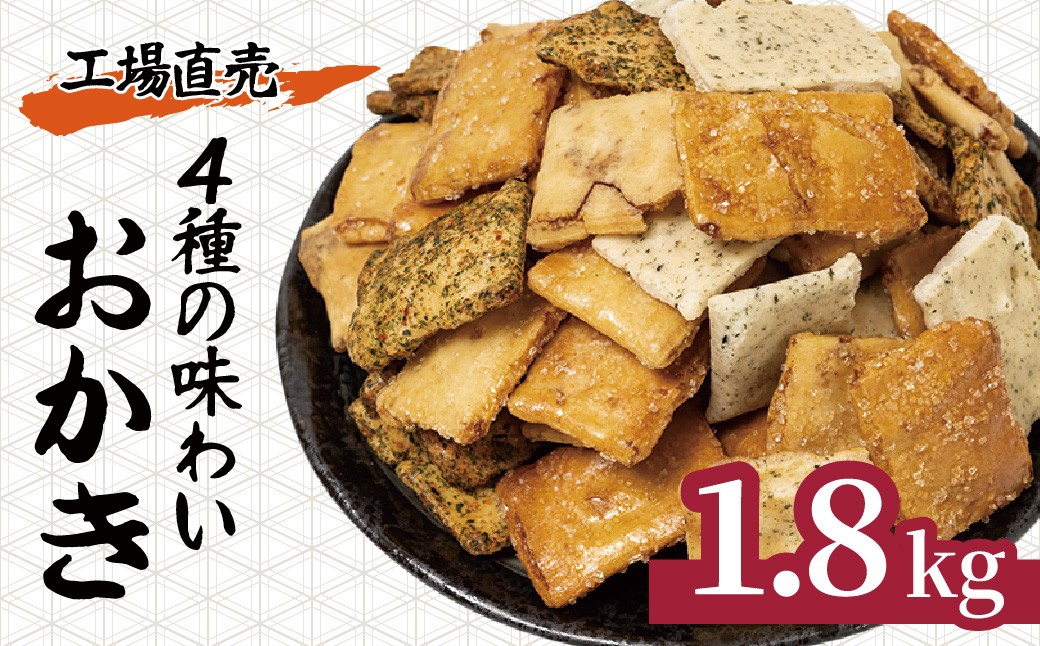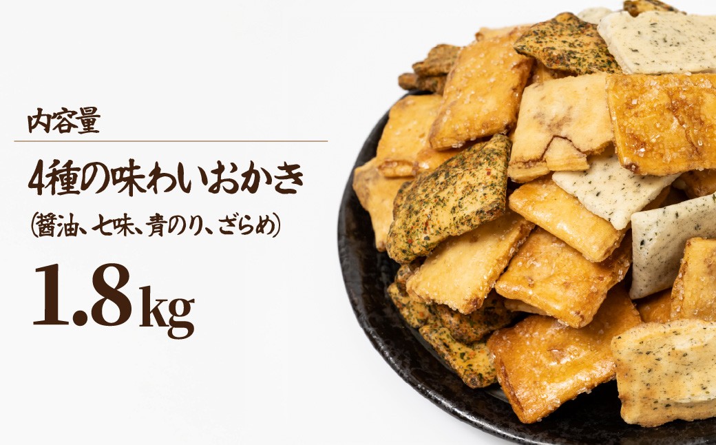 - おかき 4種の味わいおかき 1.8kg | せんべい 煎餅 おせんべい 国産米 大容量 たっぷり おかき 1800g 箱入り 食べ比べ 醤油 青のり 七味 ざらめ スナック 和菓子 詰め合わせ 手土産 ギフト 贈り物 おもたせ おやつタイム 和菓子 お盆 母の日 父の日 プレゼント 贈答用 簡易包装 もち米 工場直売 武蔵製菓 埼玉県 北本市