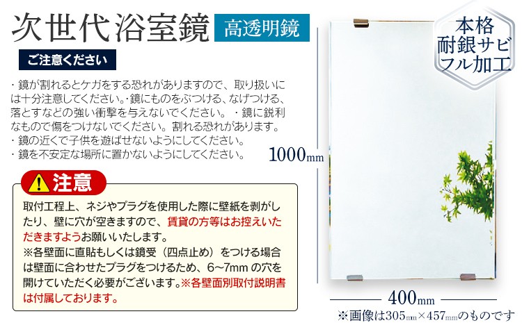 - 次世代浴室鏡(高透明鏡)400×1000mm 鏡 浴槽 お風呂 バスミラー おしゃれ ミラー フランス サンゴバン社製 九鏡 DIY 本格耐銀サビフル加工