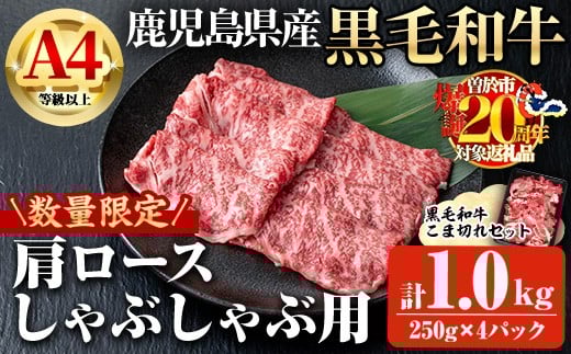 - 【数量限定】鹿児島県産黒毛和牛A4等級以上肩ロースしゃぶしゃぶ用 (計1.0kg+黒毛和牛こま切れ250g×2P) 鹿児島県産 黒毛和牛 肩ロース【ビーフ倉薗】B196-v01