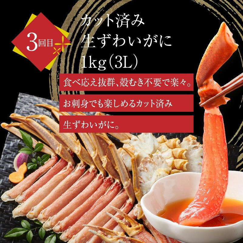 - 三大蟹 満喫 定期便 10万円 全3回 味覚 代表 それぞれの風味 食感 楽しめる かに好き たまらない 食べ比べ 名産 毛蟹 ボイル 1尾 たらばがに 脚 5Lサイズ カット済み 生ずわいがに 3Lサイズ 月替り お取り寄せ 北海道 函館市 送料無料_HS001-009