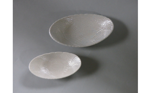 - 【伊万里焼】市川冬山窯「虹彩磁波彫り楕円皿 大・小セット」 037-H751