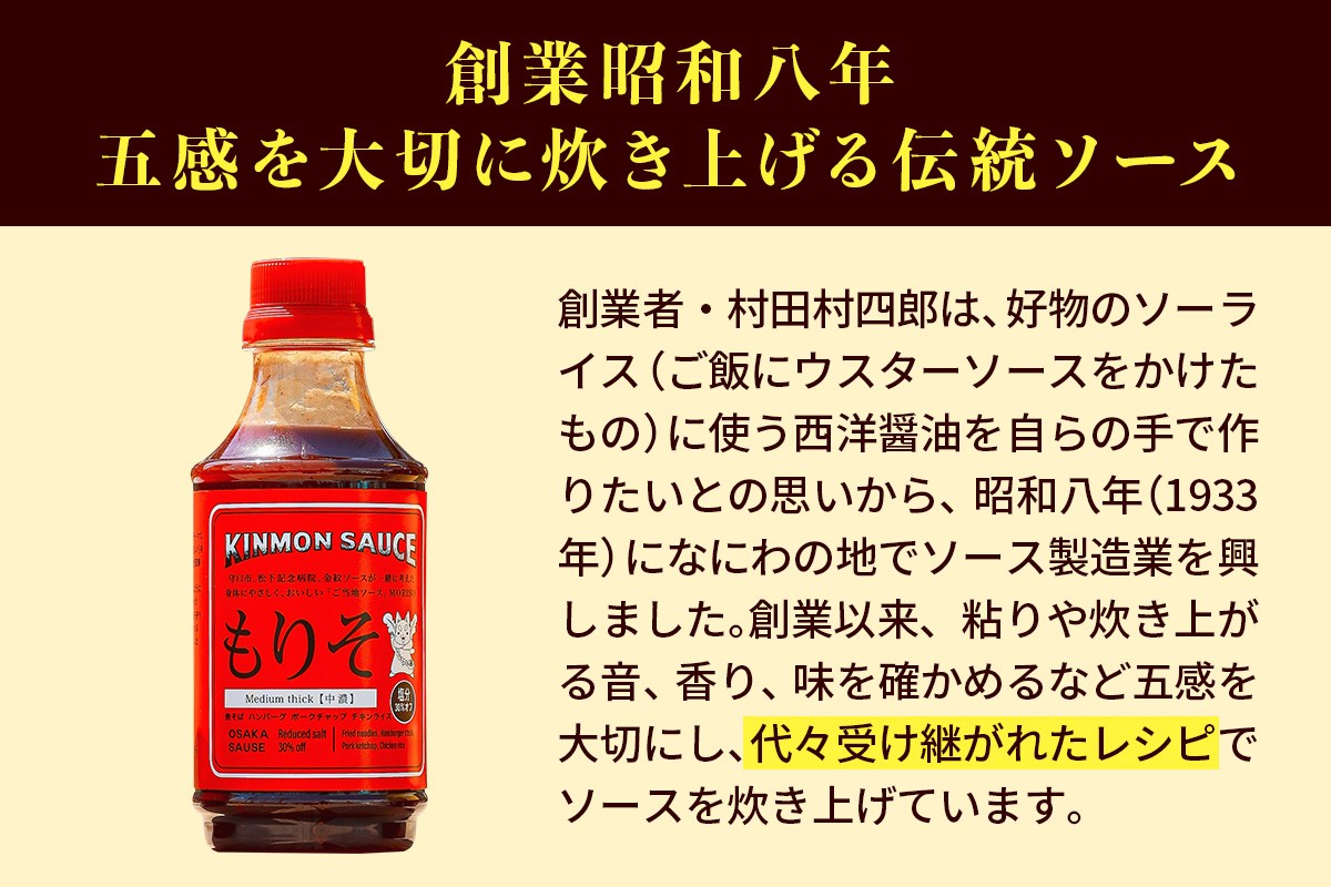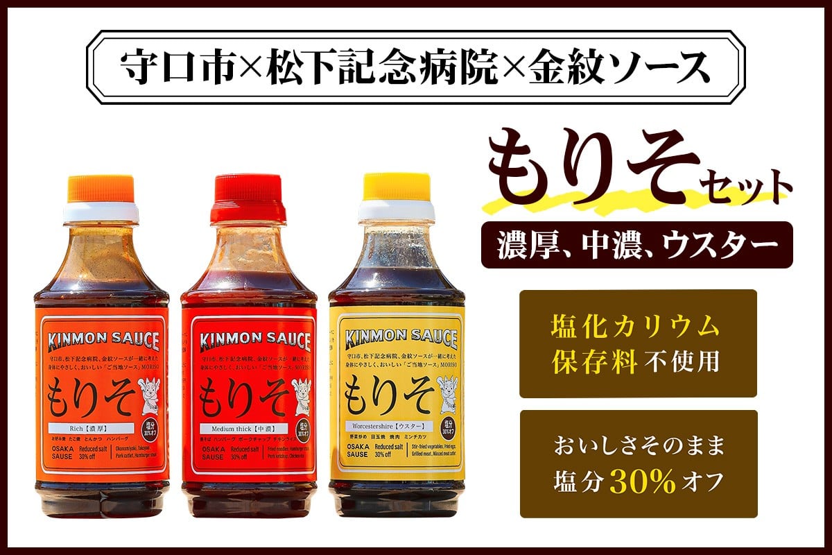 - もり吉オリジナルソース「もりそ」 310mlx3本セット (ウスター、中濃、濃厚) 守口市×松下記念病院×金紋ソース|調味料 ソース 大阪 守口市 減塩 保存料不使用 [2388]