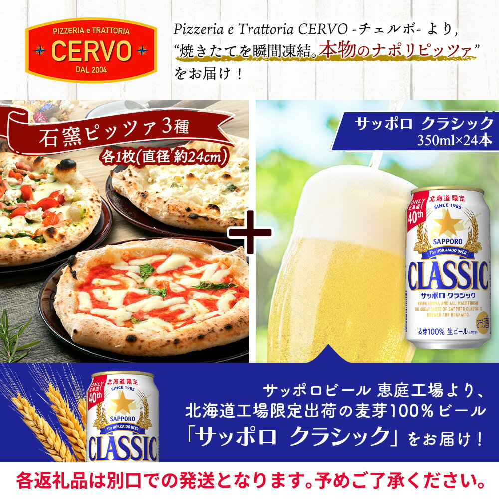 【ふるさと納税】石窯ピッツァ 3枚 マルゲリータ クワトロフォルマッジ ジェノベーゼ サッポロクラシック 350ml 24本 コラボ ピザ サッポロビール サッポロ クラシック ビール 生ビール ふるさと納税 北海道 恵庭市【C99017】