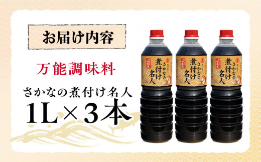【釣り名人御用達】煮付簡単調味料 さかなの煮付け名人 1L×3本セット 醤油 うす塩 健康 濃口 和食 醤油 しょう油 しょうゆ お醤油 セット 詰め合わせ 調味料 大豆 発酵食品 刺身 煮物 だし だし醤油 出汁醤油 出汁 濃口 濃い口 こいくち 安心 安全 手作り コク 旨味 国産 料理 グルメ 保存 リピート ギフト 人気 広島県産 江田島市/濱口醤油 [XAA072]