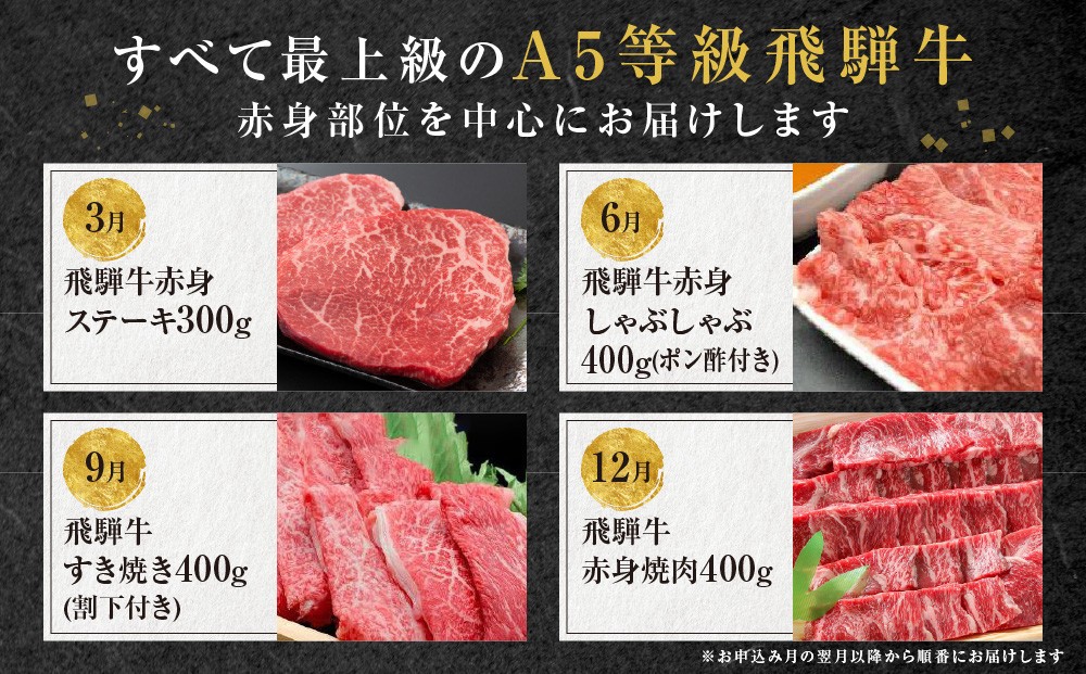 A5等級飛騨牛 定期便 4回(ステーキ/しゃぶしゃぶ/すき焼き/焼肉)【3月・6月・9月・12月発送】| 冷蔵配送 定期便 飛騨牛 赤身 年4回お届け おいしい 人気 飛騨高山 岩ト屋 HF109