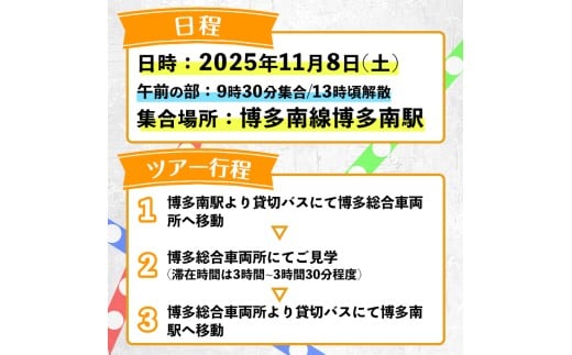 <午前の部>博多総合車両所見学ツアー(1名様分<1名まで同伴可>)数量限定 新幹線 ツアー 体験 チケット 利用券 ペア 旅行 無料送迎 【ksg1503-A】【株式会社日本旅行】
