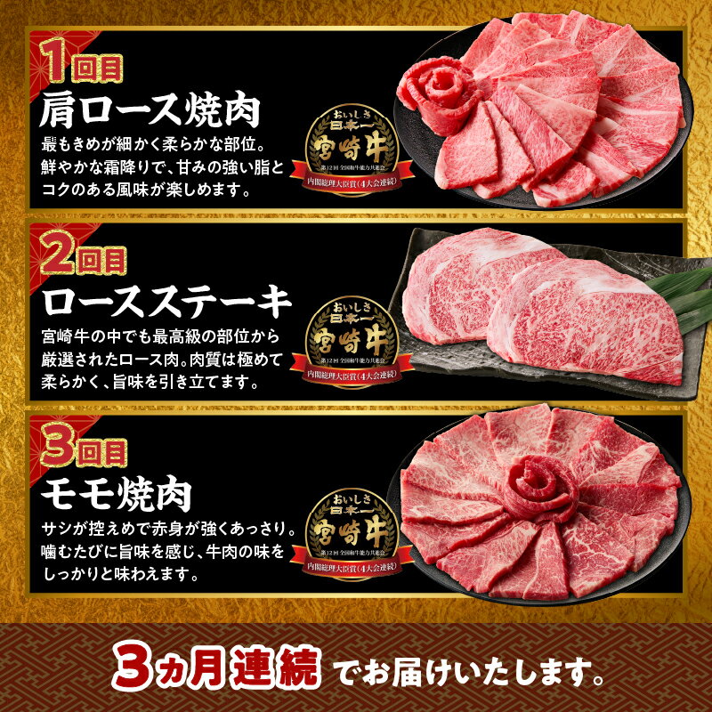 【ふるさと納税】【3か月定期便】宮崎牛焼肉3か月定期便| 牛肉 肉 3回 ロース 肩ロース モモ 焼肉 サシ 霜降り ブランド牛 国産牛 和牛 グルメ お取り寄せ 贈り物 ギフト 贈答 プレゼント アウトドア キャンプ バーベキュー BBQ グランピング