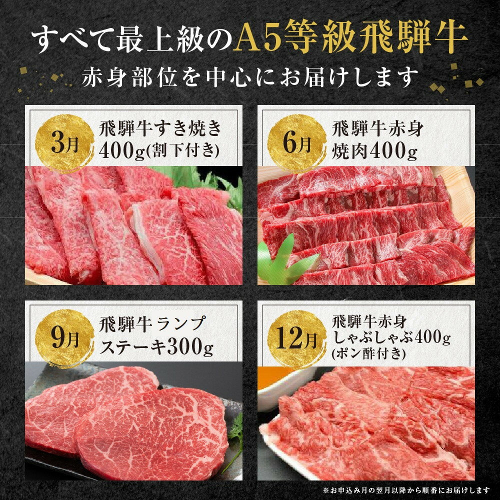 【ふるさと納税】A5等級飛騨牛 定期便 4回(すき焼き/ステーキ/焼肉/しゃぶしゃぶ)【3月・6月・9月・12月発送】| 冷蔵配送 定期便 飛騨牛 赤身 年4回お届け おいしい 人気 飛騨高山 岩ト屋 HF108