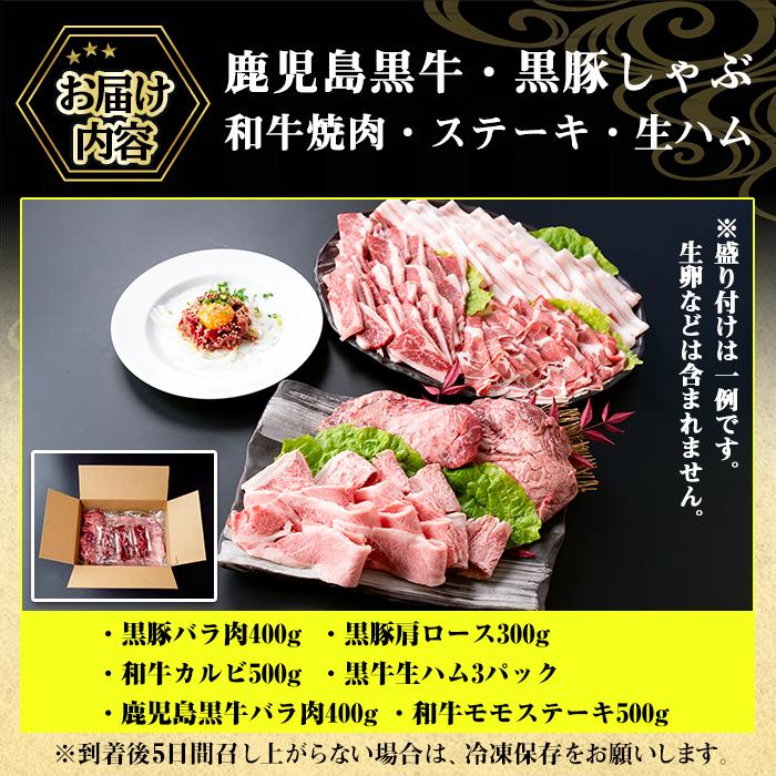 No.454 鹿児島黒牛・黒豚のしゃぶしゃぶと和牛焼肉・ステーキと生ハムの贅沢セット(6種・計2.1kg超) 国産 九州産 鹿児島県産 豚肉 ぶた肉 牛肉 黒豚 バラ肉 肩ロース 和牛 カルビ 黒牛 生ハム もも肉 ステーキ しゃぶしゃぶ 焼肉 バーベキュー【やきにく茶屋和昇】